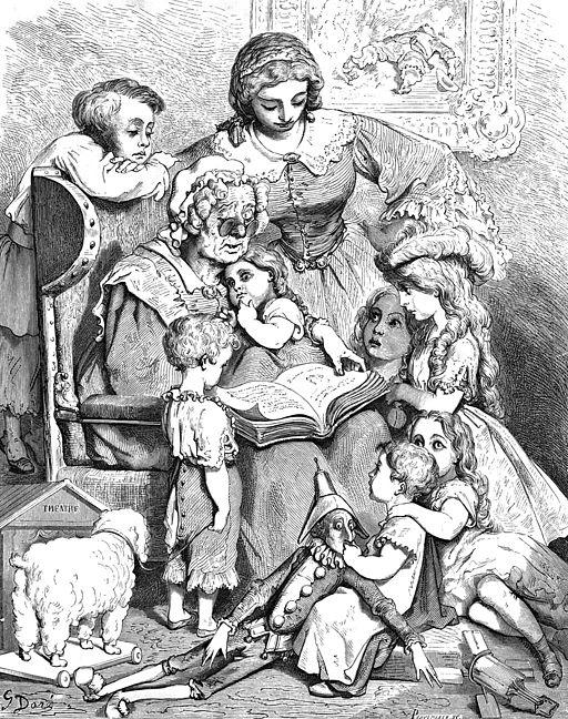 | Madre ganso leyendo cuentos de hadas Ilustración: Gustave Doré, Wikimedia commons |