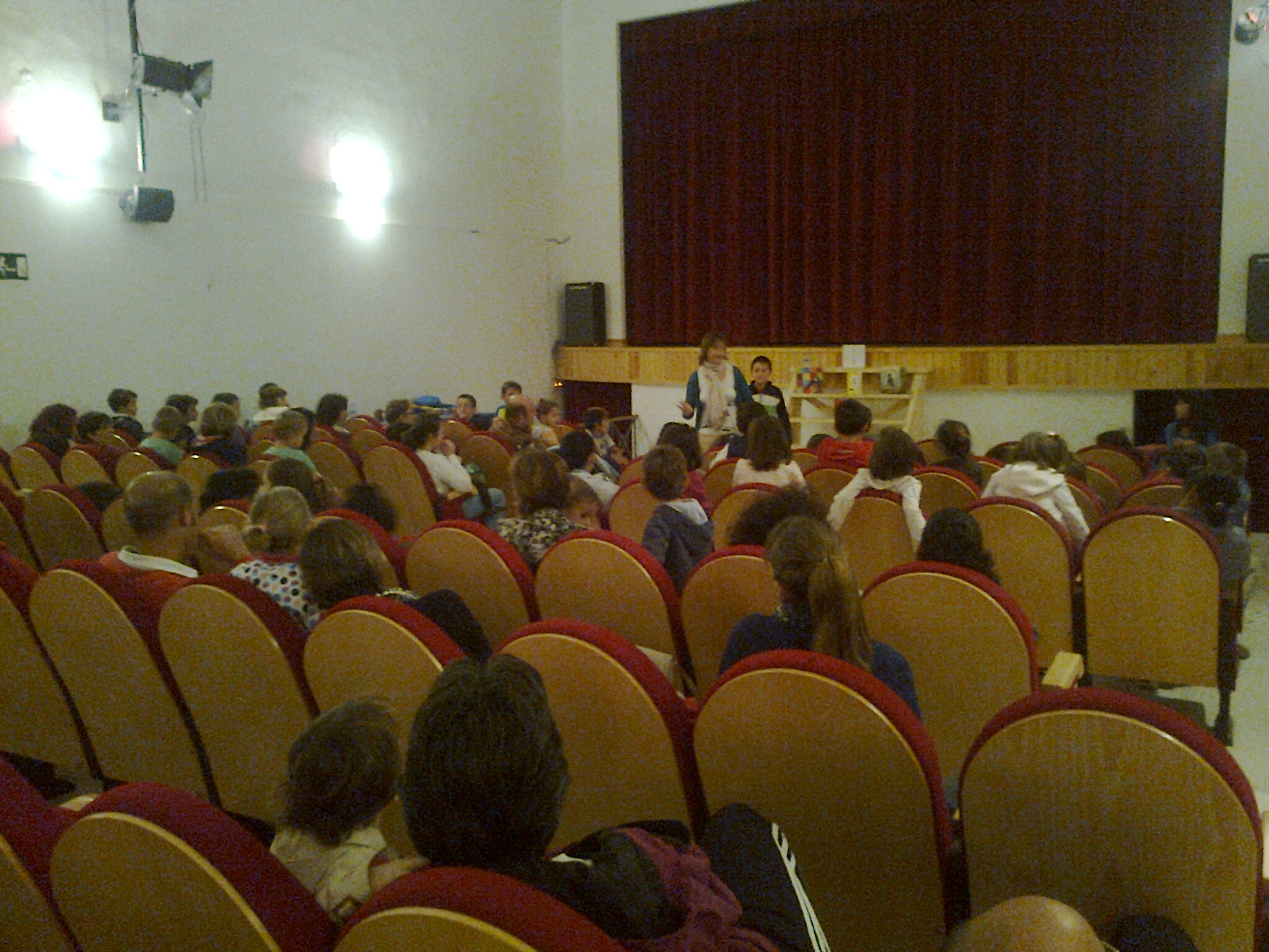 La biblioteca de Almudévar es pequeñita, están a la espera de terminar las obras de la nueva biblioteca, ya les queda poquito, por eso los cuentacuentos se hacen abajo, en el cine. ¡Menuda sala! Es gigantesca. En las fotos se ve menos de la mitad de la sala. Yo creo que cada año en Almudévar hay más niños. Como se nota el trabajo de esas bibliotecarias que trabajan día a día, granito a granito, libro a libro, y saben arrastrar a todo el mundo a acercarse a la biblioteca. Y desde luego, Belén es de esas bibliotecarias.