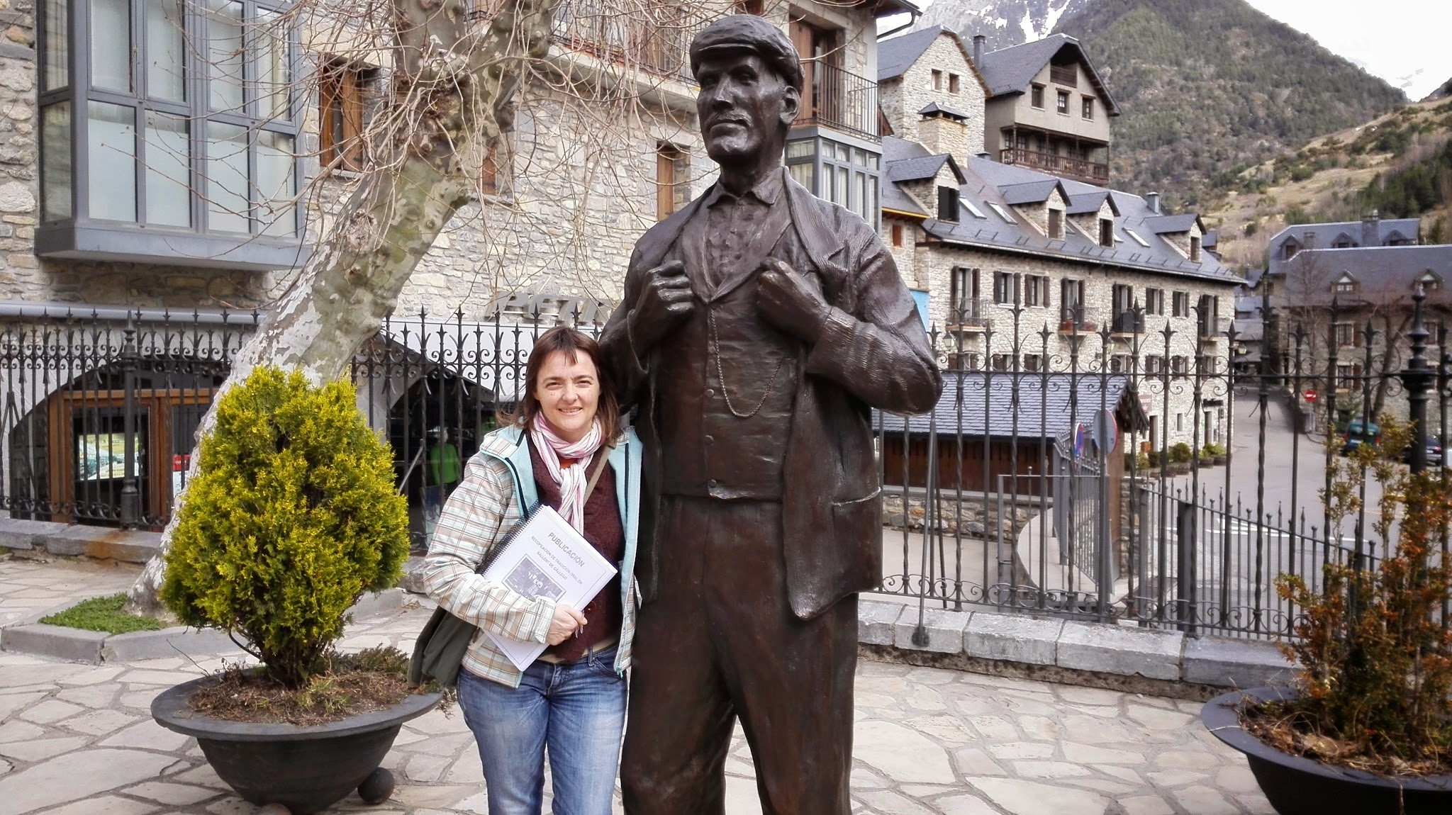 Os dejo una foto del día que fui a entregar el trabajo terminado al Ayuntamiento de Sallent de Gállego. En la foto estoy junto a la escultura a tamaño natural de Fermín Arrudi, el gigante de Sallent.