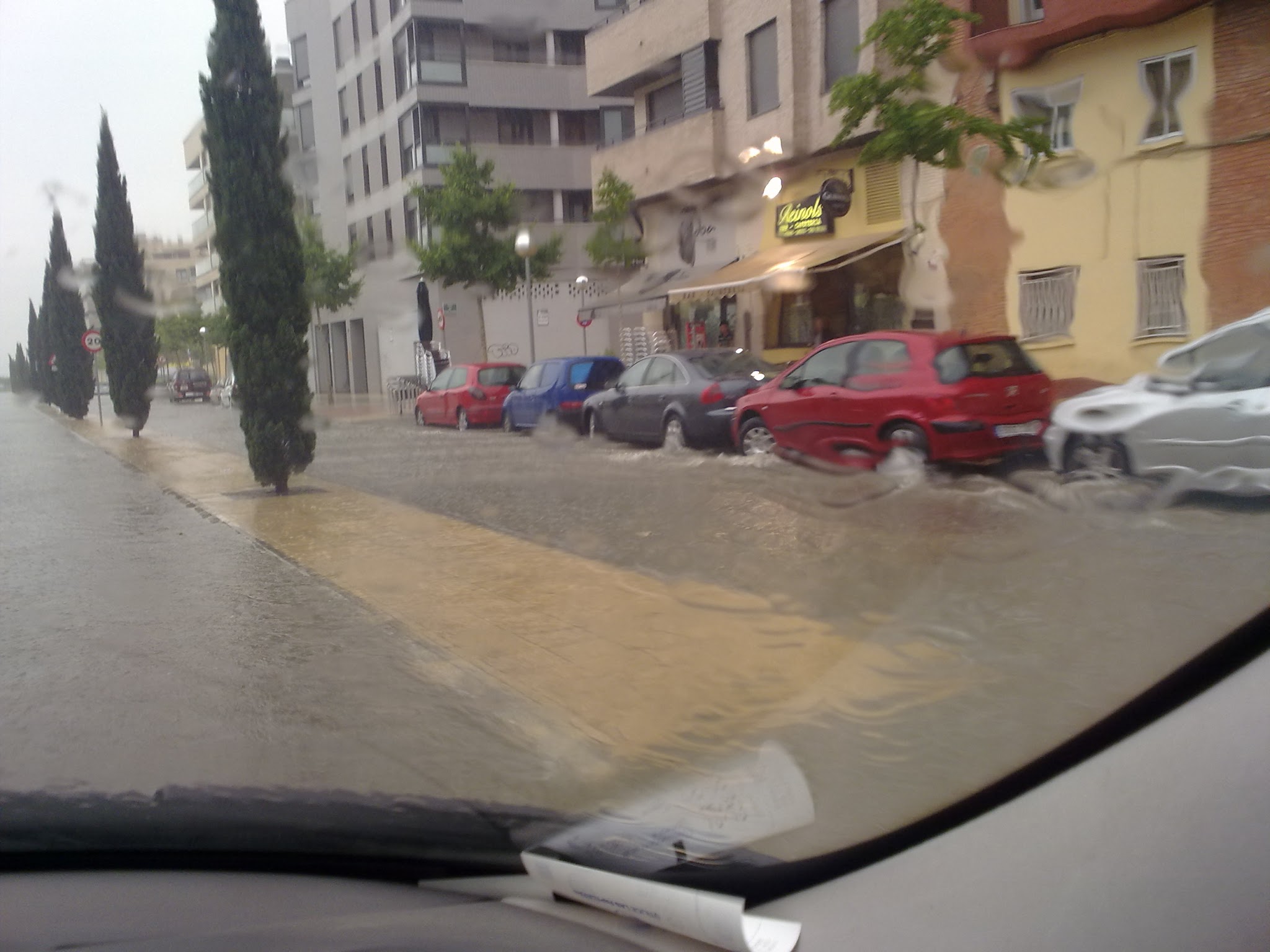 El sábado por la tarde, tocaban cuentos en la bibliteca de Lanaja. Cuando salimos de Huesca, llovía tanto que me llevé conductor, cayó una tromba de agua tremenda. Estas fotos son de la avenida Monegros justo cuando salíamos de Huesca. La rotonda de la avenida estaba inundada y la alcantarilla rebosaba de agua.