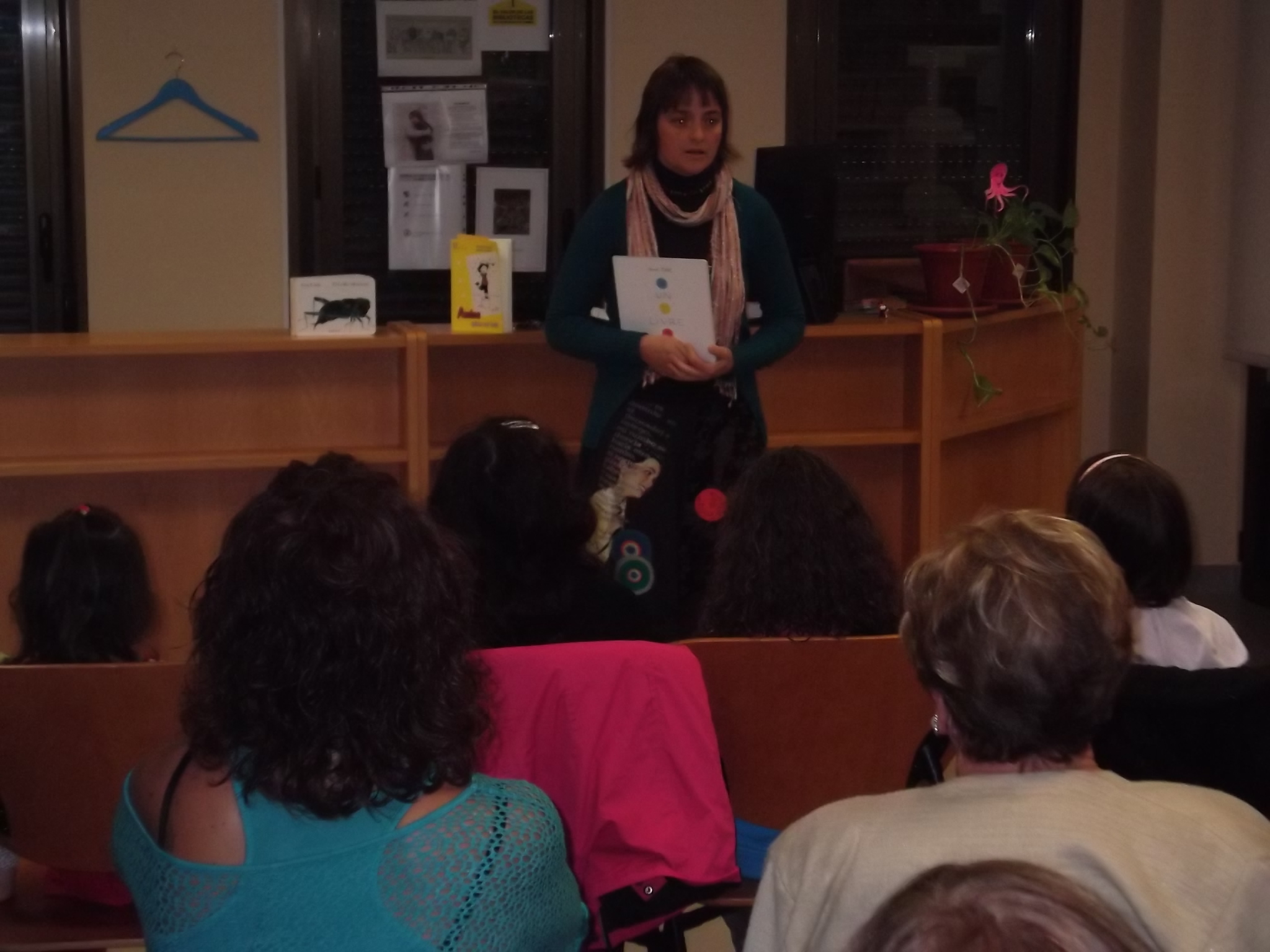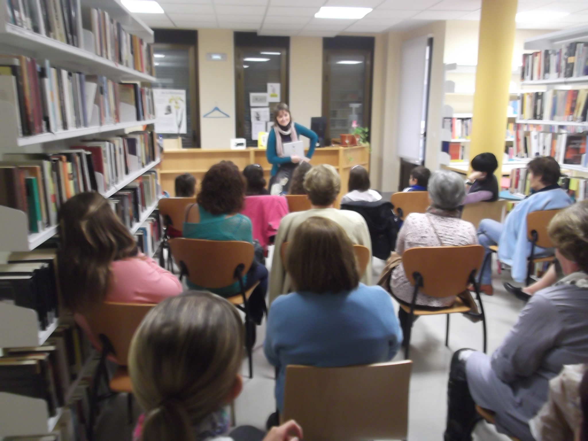 La biblioteca se fue llenando poco a poco. La verdad es que con lo que caía no teníamos mucha esperanza de que la gente se atreviera a salir de casa, pero al final, pequeños y mayores llenaron la biblioteca.