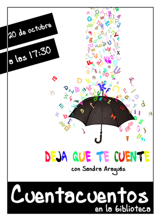 Y por fin llegamos a Lanaja. En la biblioteca nos esperaba Pilar, con el paraguas preparado para evitar el chaparrón. El paraguas debía ser premonitorio de la luvia que iba a caer este sábado, porque fijaros que ya en el cartel del cuentacuentos Pilar había puesto uno, eso sí, sobre él caían letras y letras. Mirad que chulada.