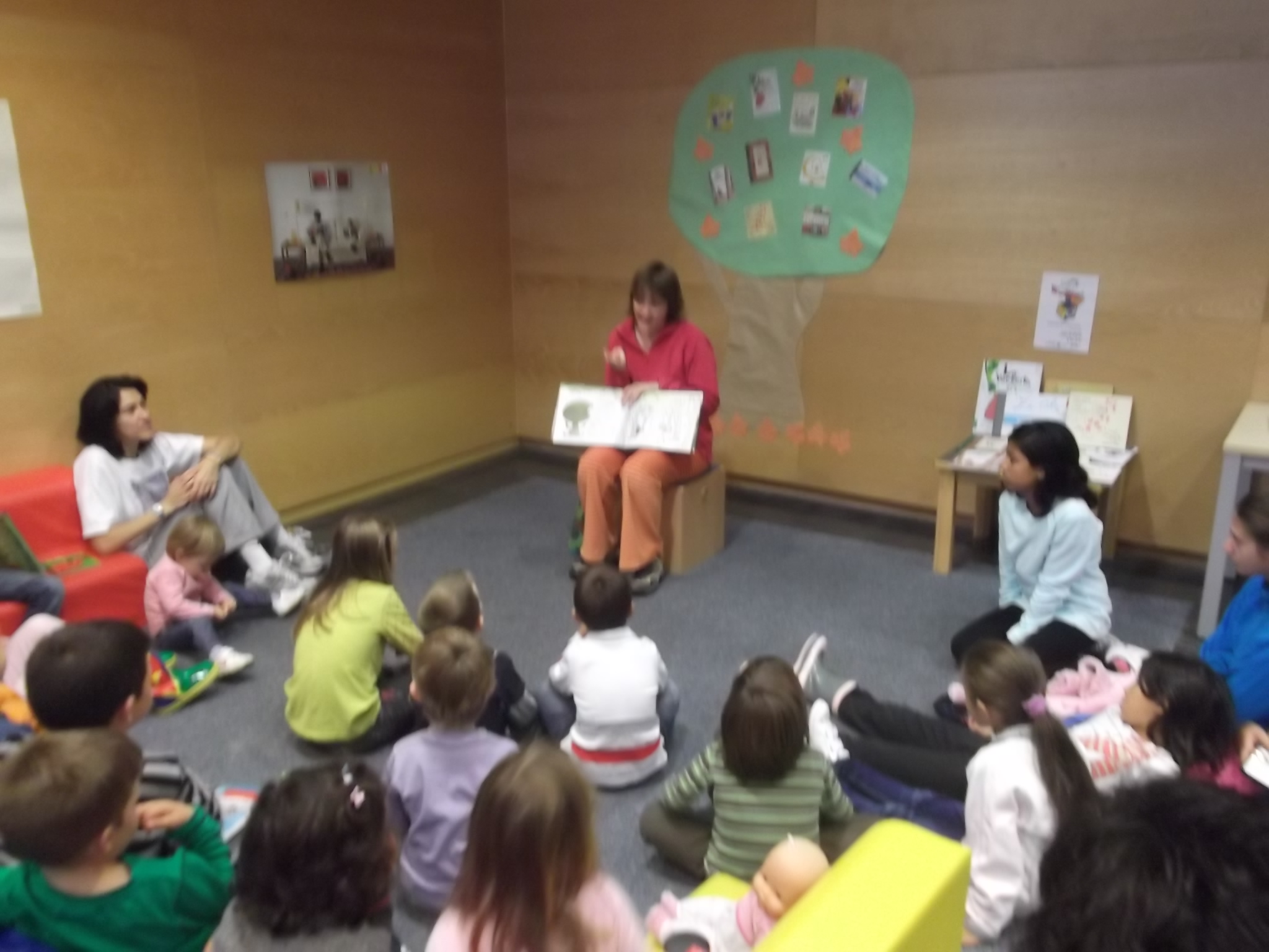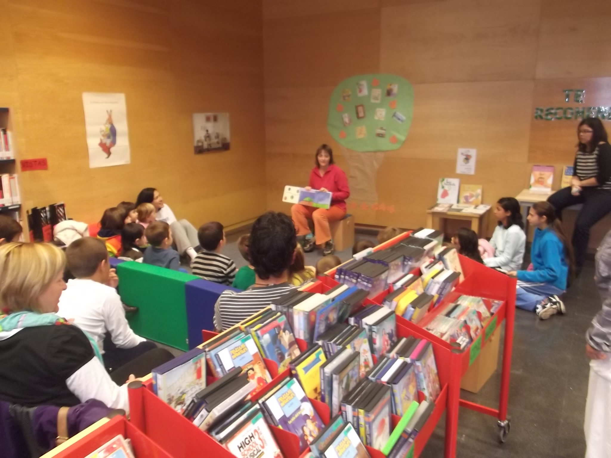 La manera de contar en la biblioteca Sender me encanta, es tranquila, sentada, y sobretodo, con mucho cuento físico y albúm para que luego los más menudos puedan cogérselos y llevarlos a casa.Todos los sábados, excepto el primero del mes, pasamos una horita juntos, yo contandos y ellos escuchando. Un verdadero placer.