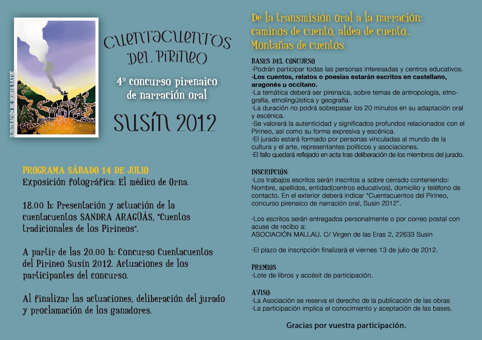 Hace unas semana Angelines me llamó porque estaba organizando el IV Concurso pirenaico de narración oral. Se trata de una jornada en la que se exponen, oralizan o teatralizan los cuentos enviados para el concurso que por cuarto año consecutivo pretende atraer gente a Susín y dar a conocer toda su belleza, y que mejor excusa que las tradiciones y los cuentos para hacerlo.